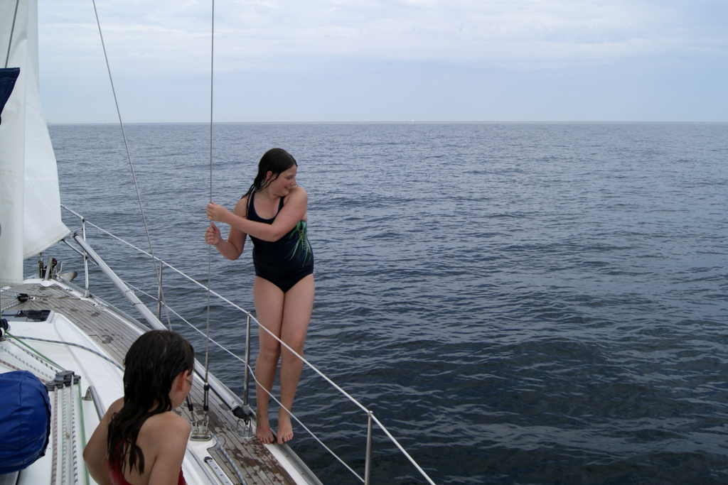 Die Segel füllen sich wieder und wir machen mehr Fahrt. Die Kinder klettern an Bord und lassen sich von der Sonne trocknen. Julian legt sich auf seinen Lieblingsplatz auf dem Vorschiff und schläft. Fee leistet ihm Gesellschaft. Lara liest und hört Musik. Pia aalt sich auf der Badeplattform. Und Markus und Melanie haben Zeit für nette Gespräche über Gott und die Welt im Allgemeinen und das Segeln im Speziellen.